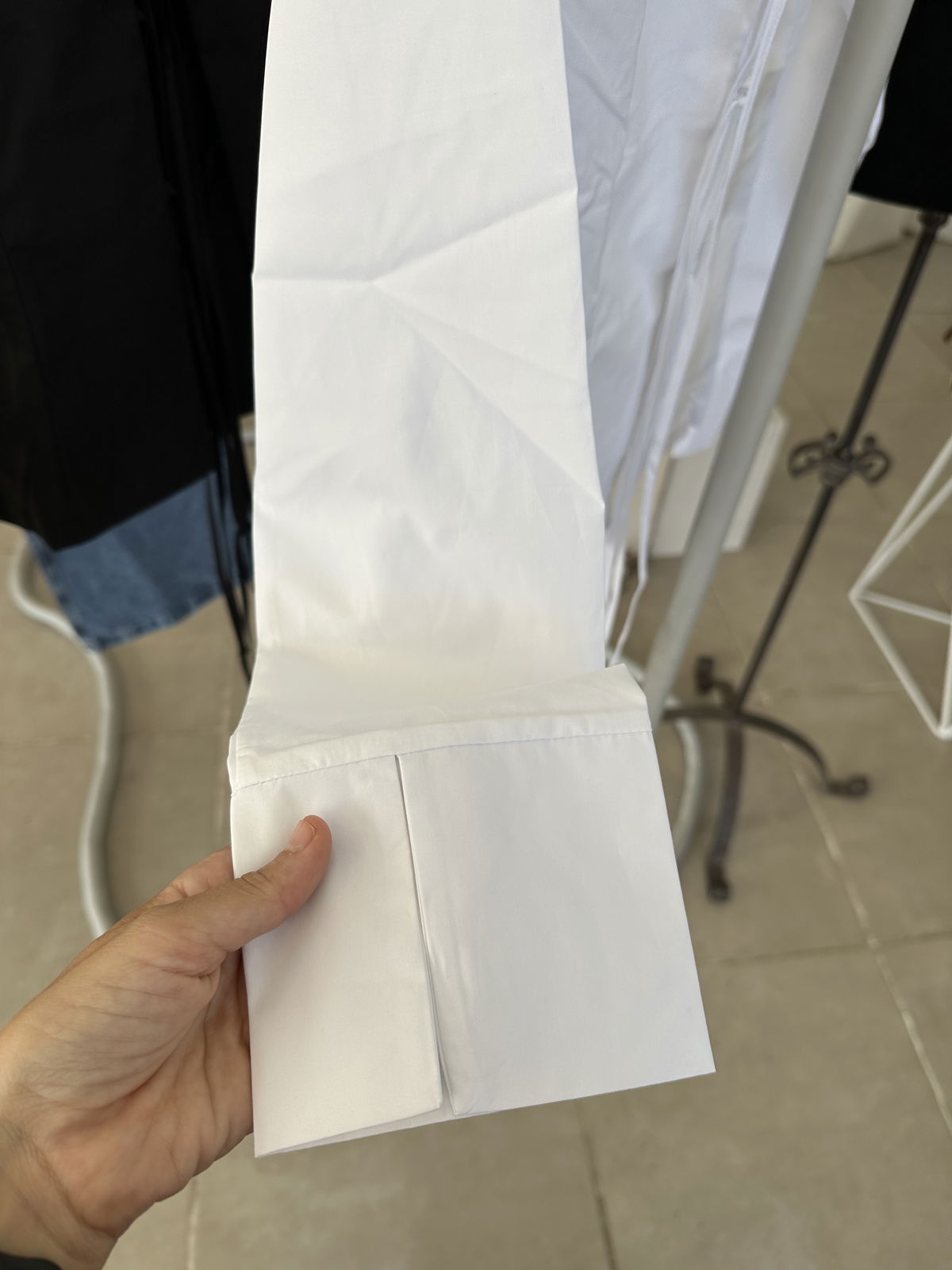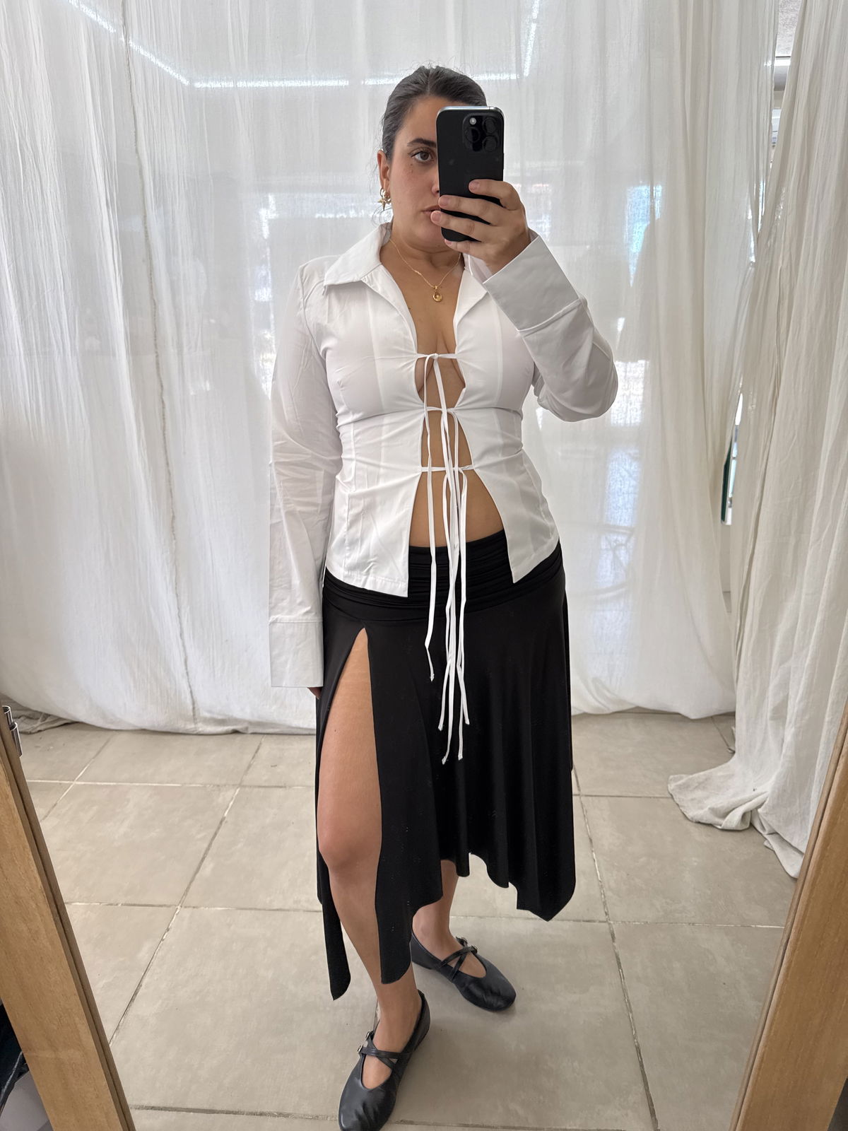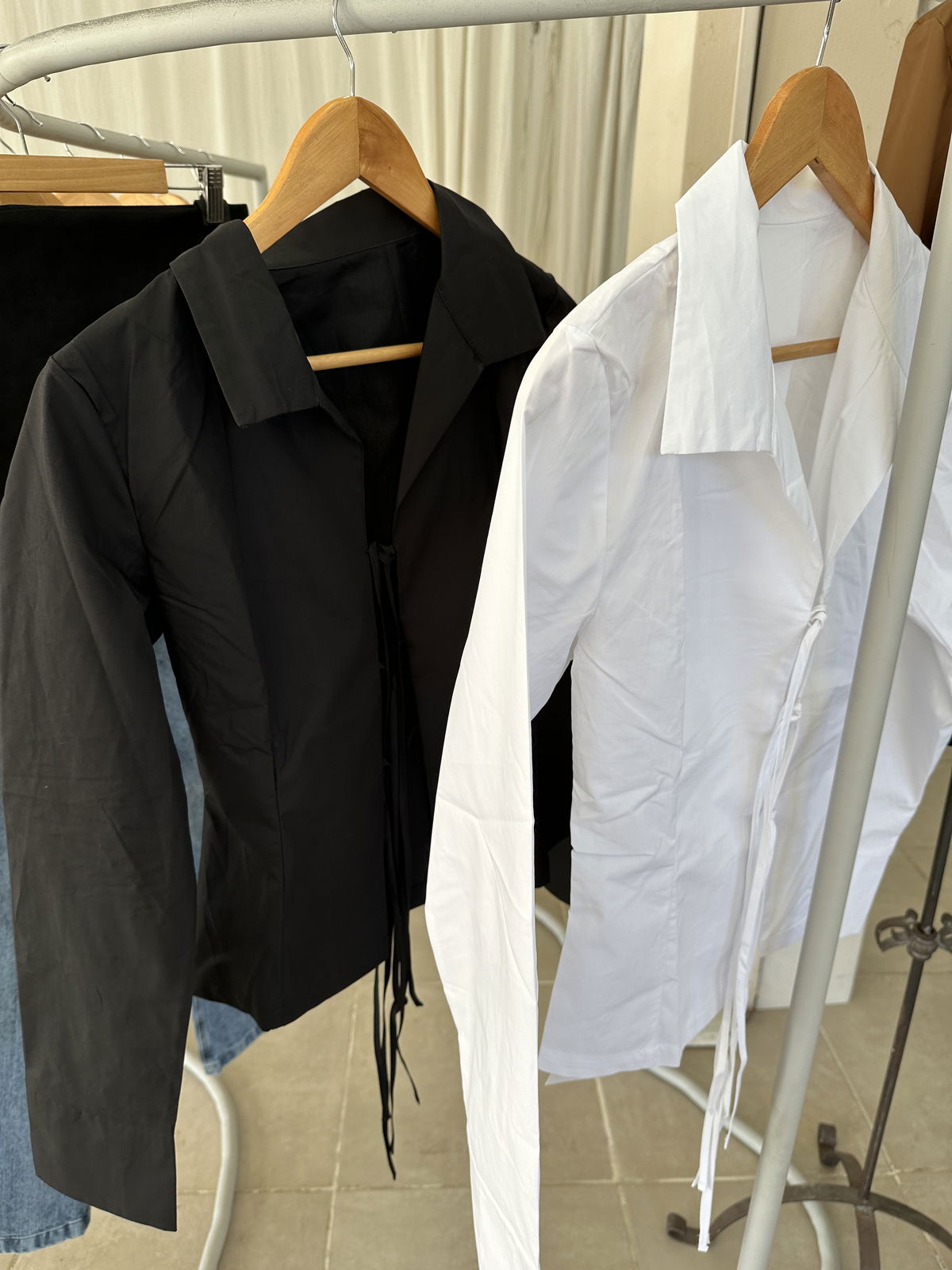 Camisa importada de poplin rígido ceñida en la cintura con tiras ajustables. El modeloqueda abierto.