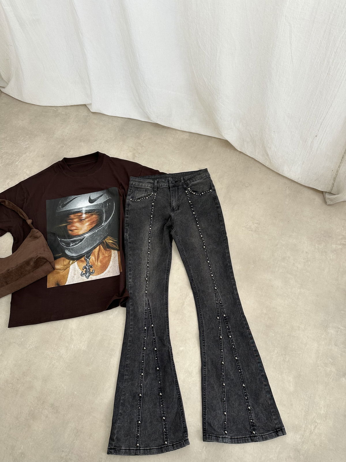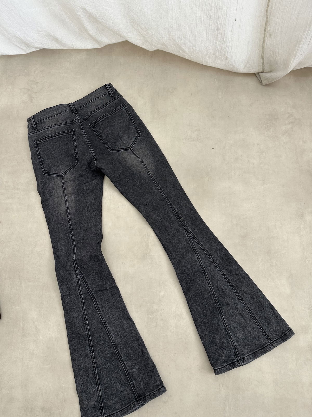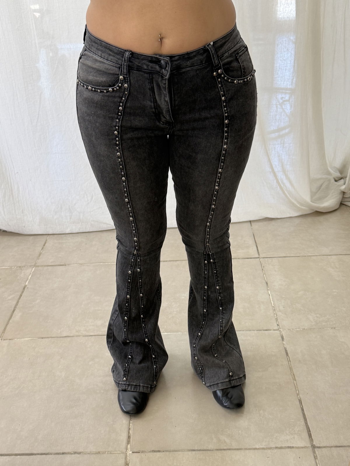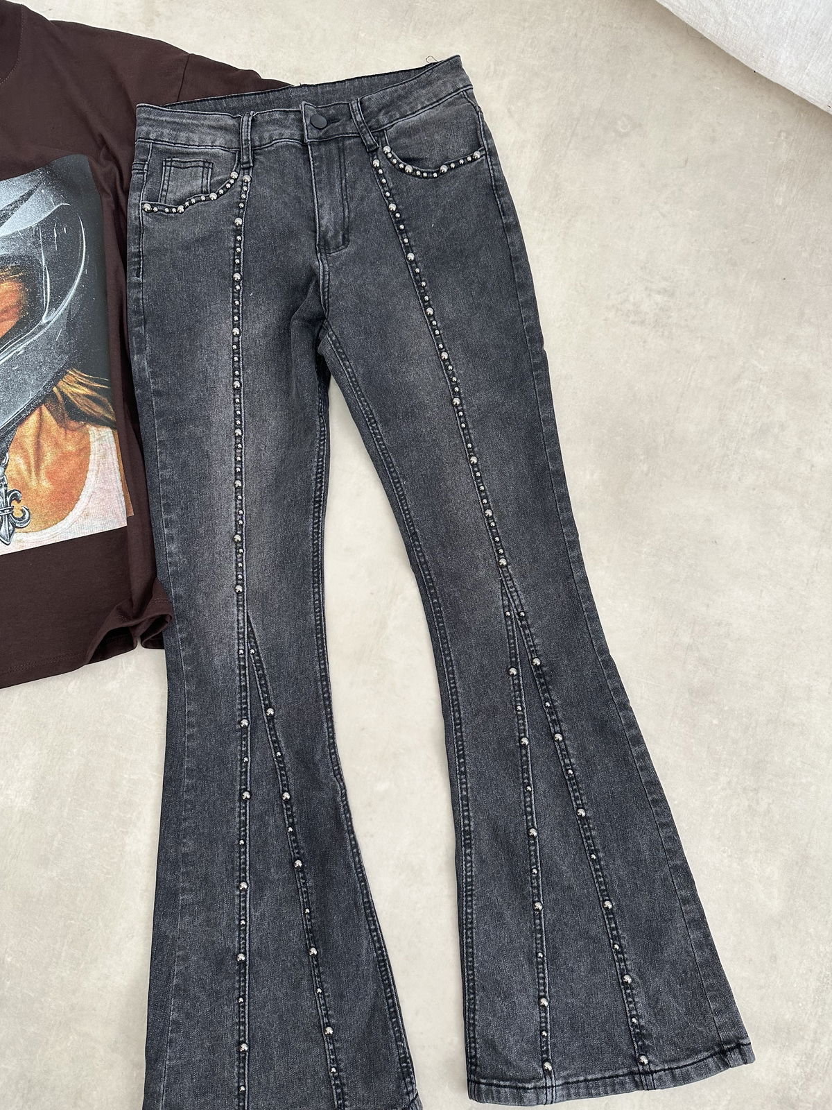 Jean elastizado de corte flare con tachas remachadas.