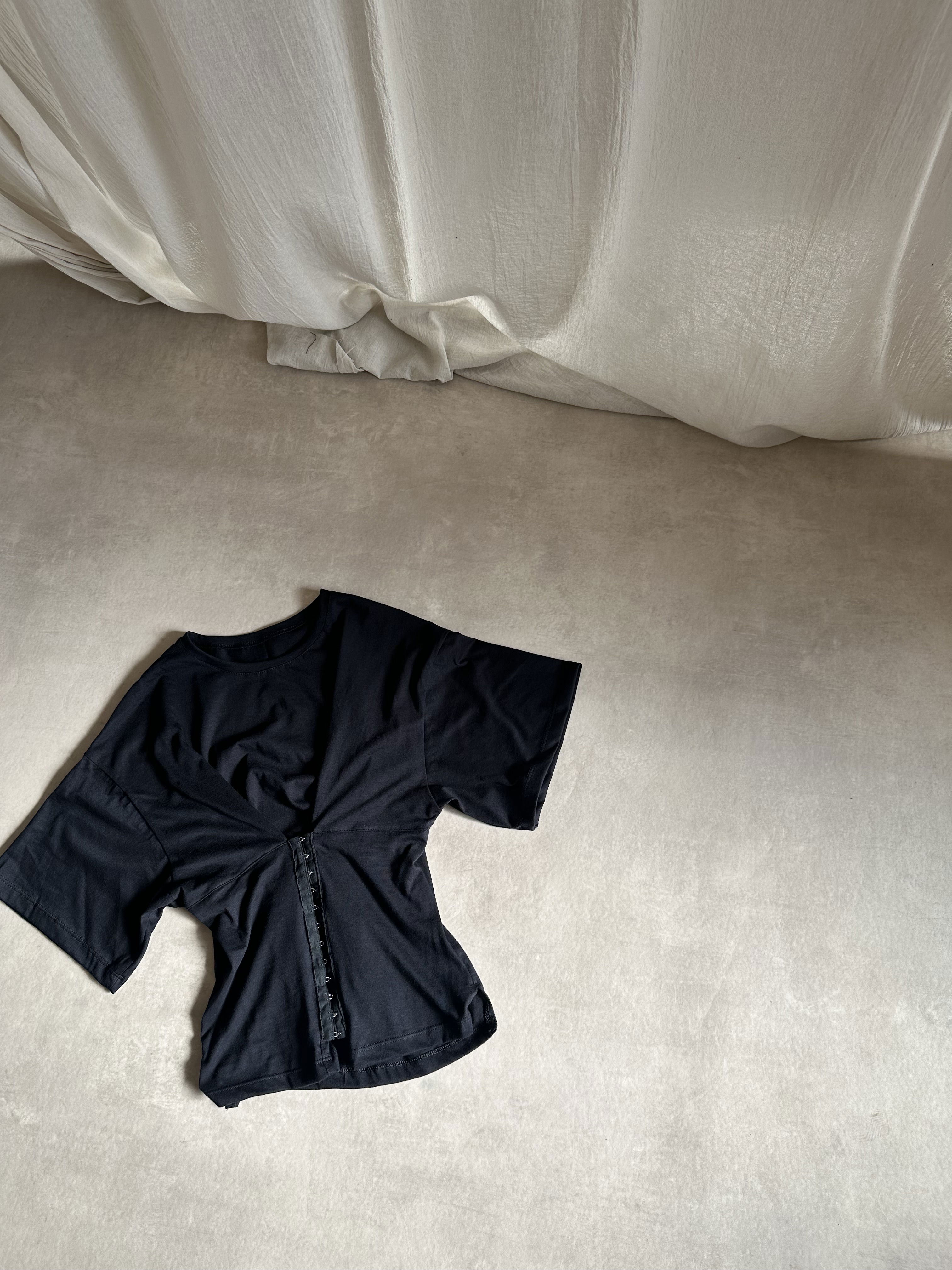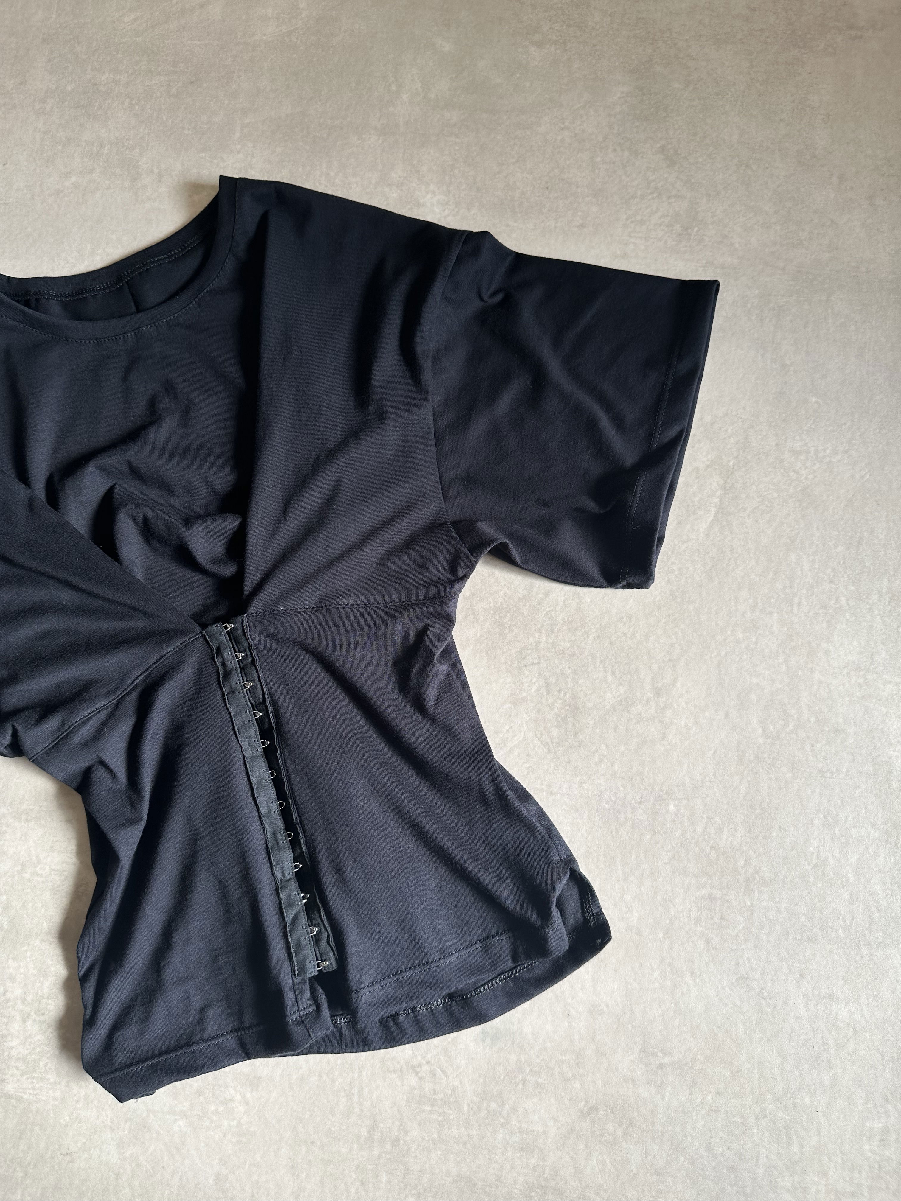 Remera de algodón con detalle de broches en el frente que al cerrarlo se transforma en corset