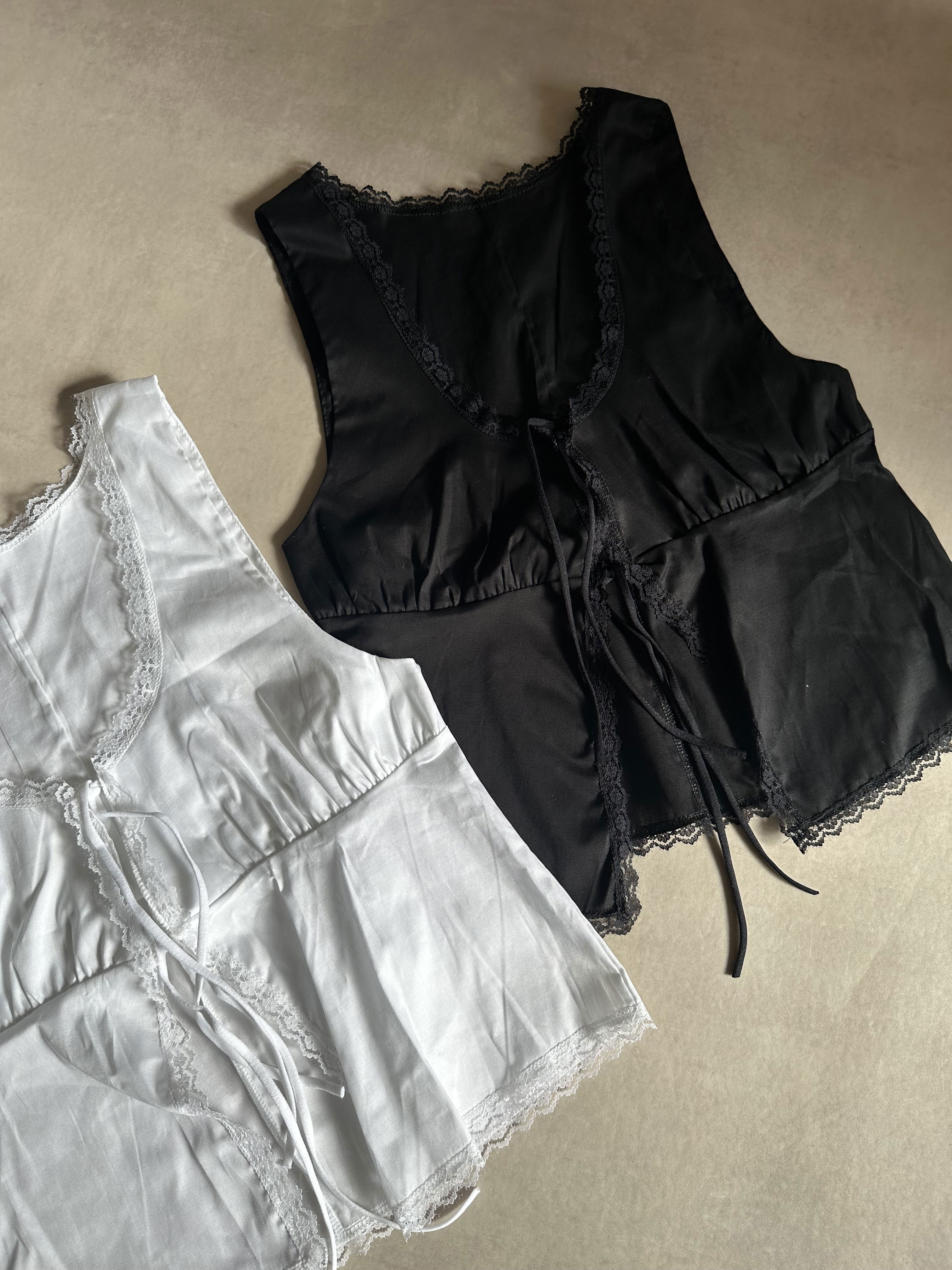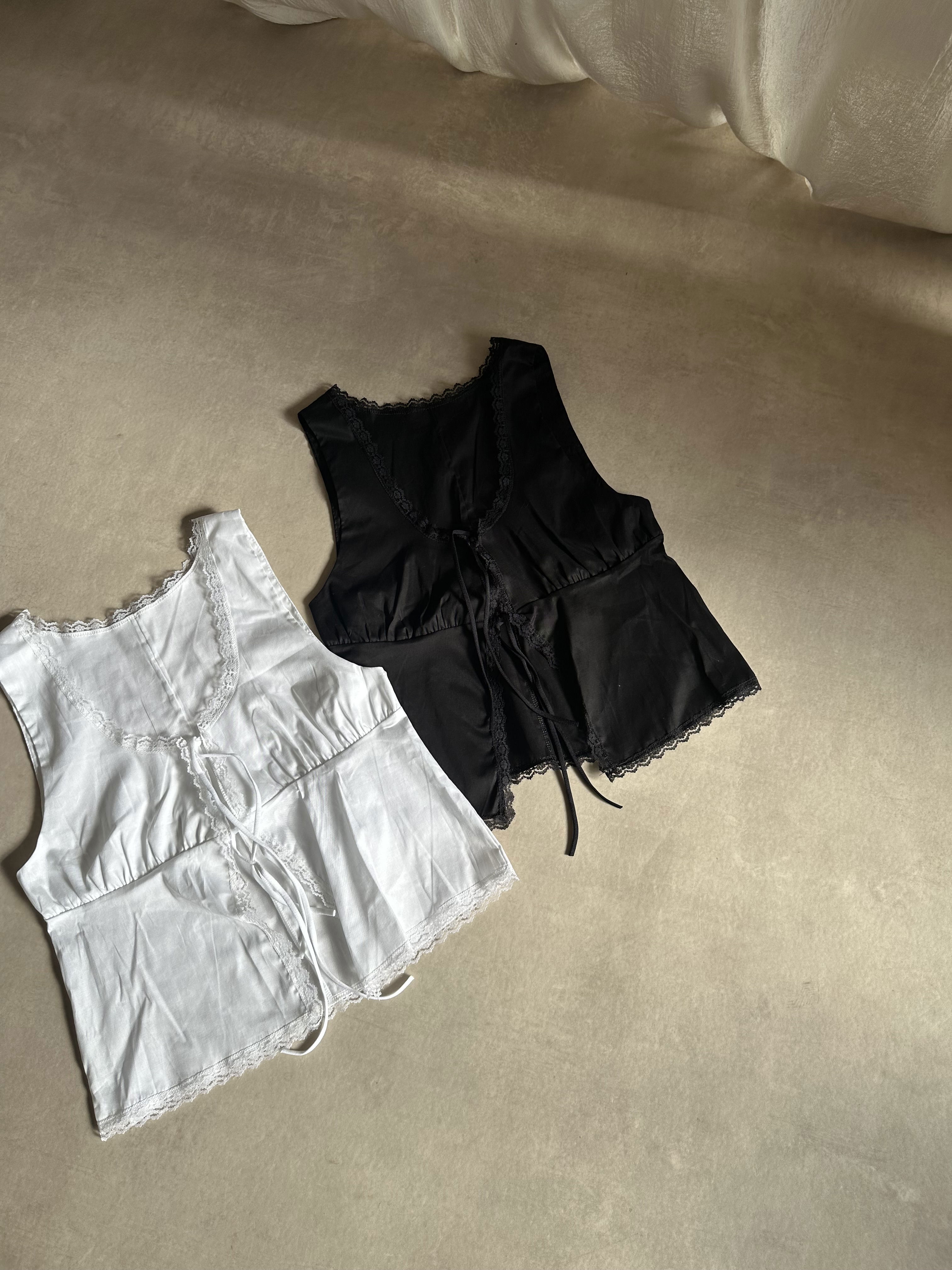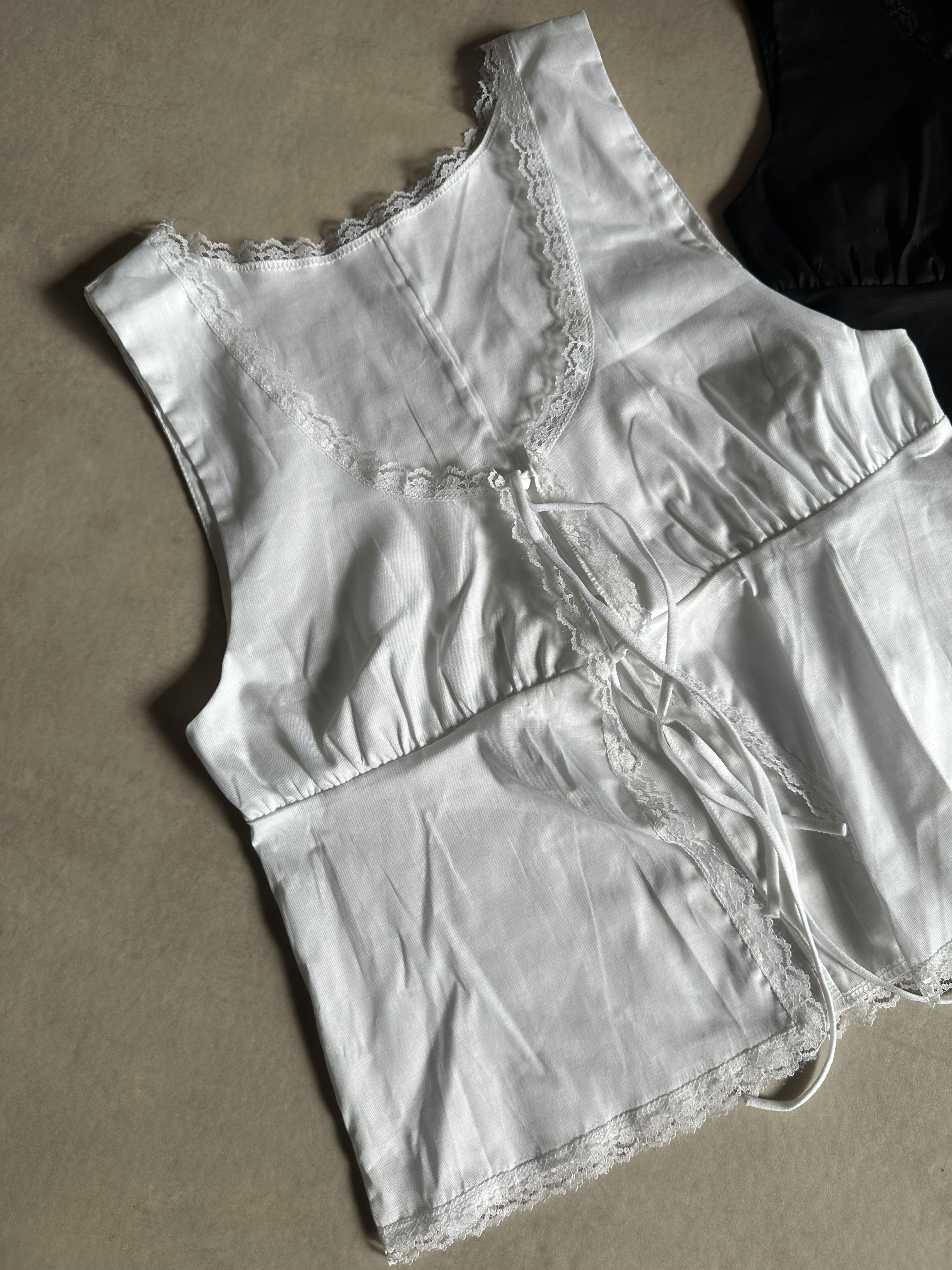 Blusa de poplin semi elastizada con detalle de puntilla y lazo elástico