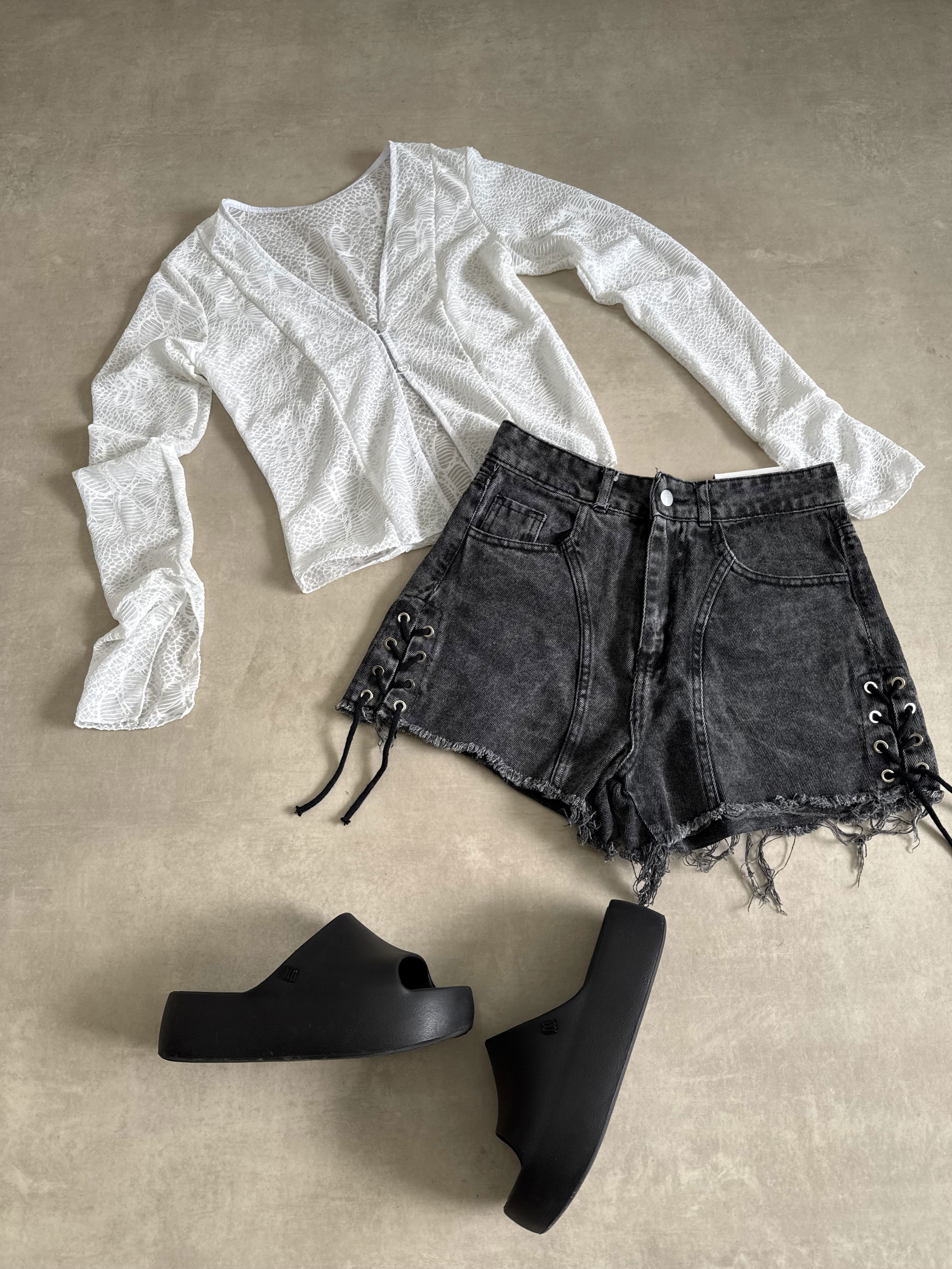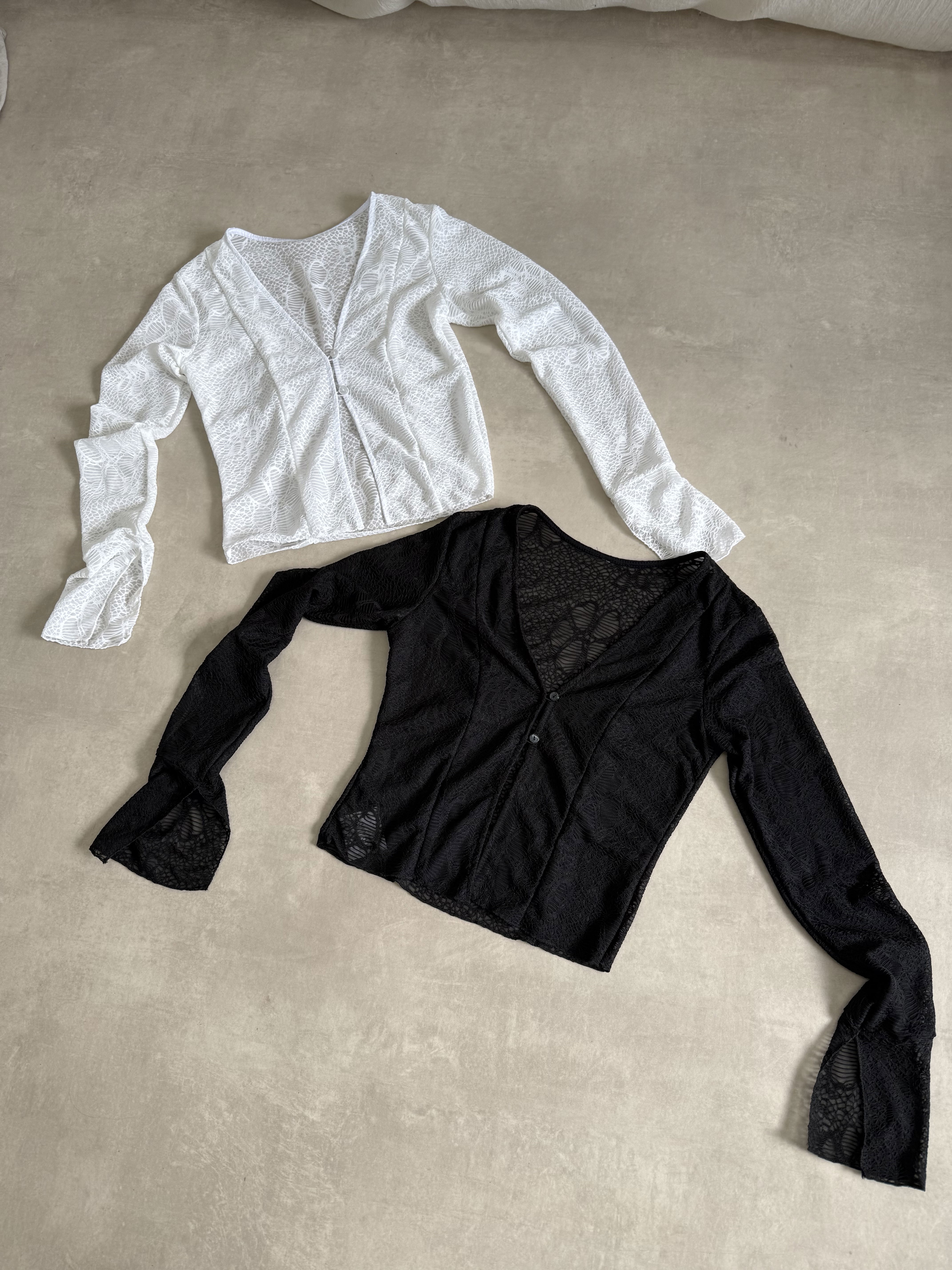 Top manga larga de micro tul con encaje. Sus mangas son Oxford y cuenta con dos botones al tono en el frente que se amarran con elástico.