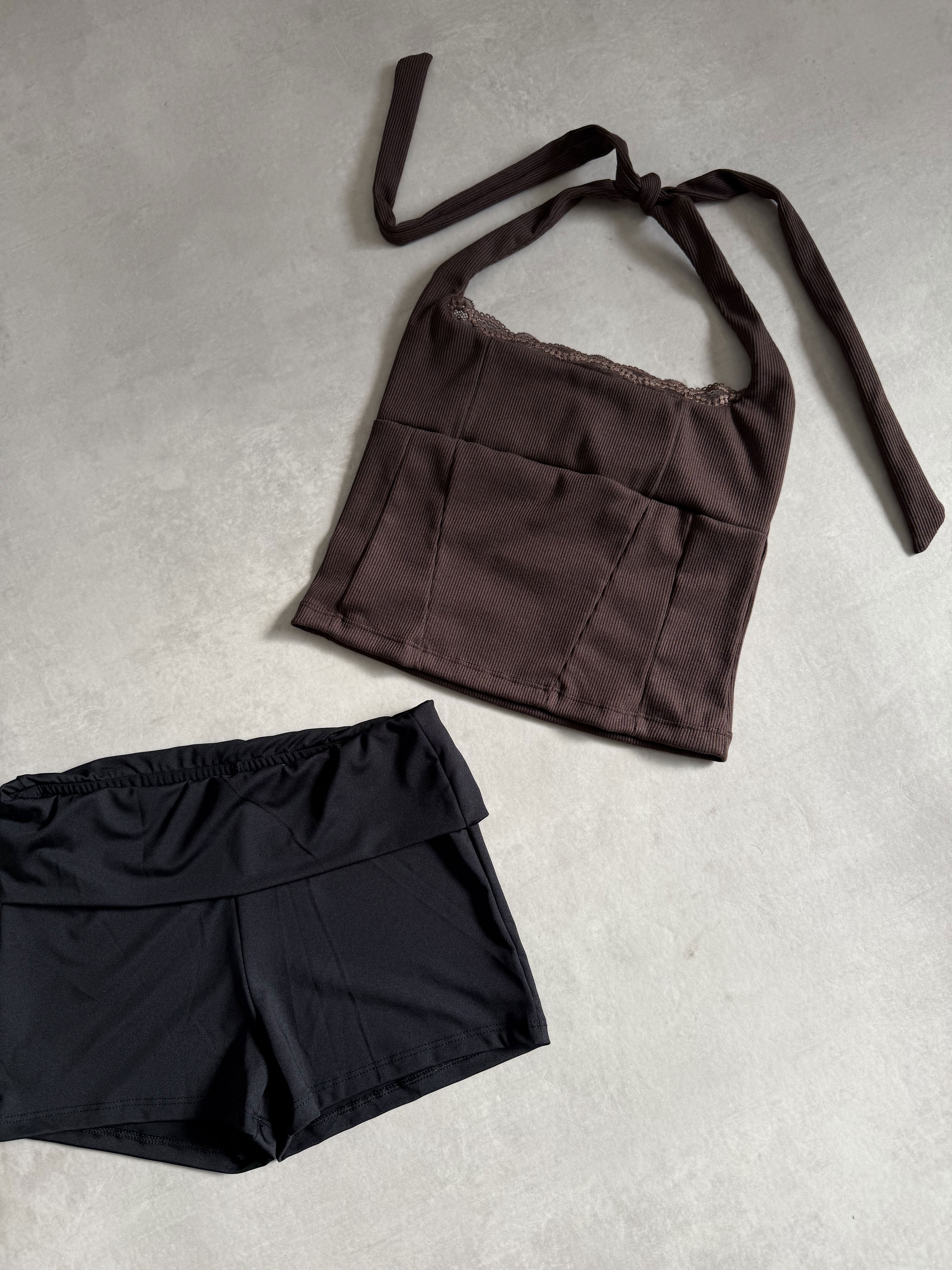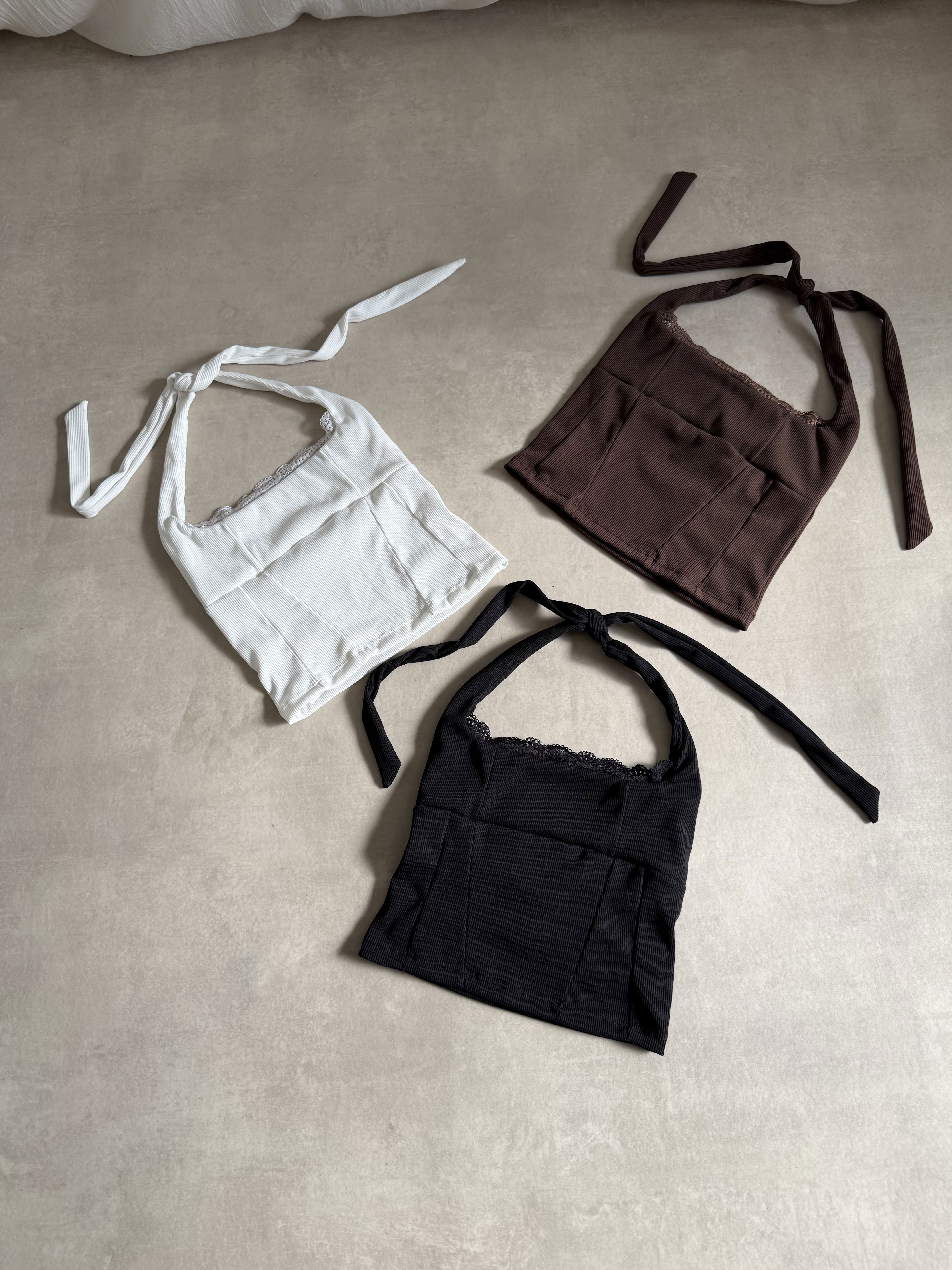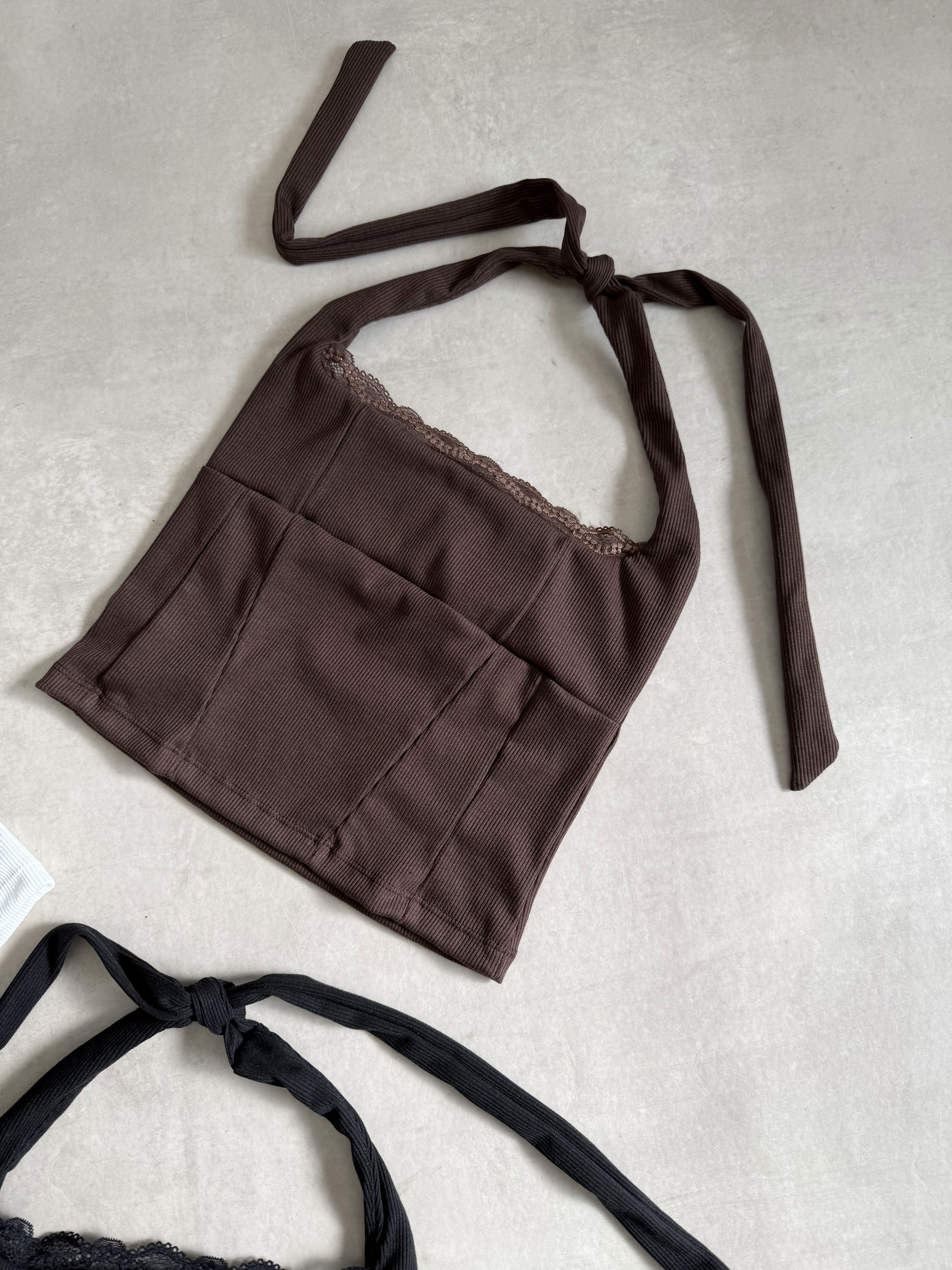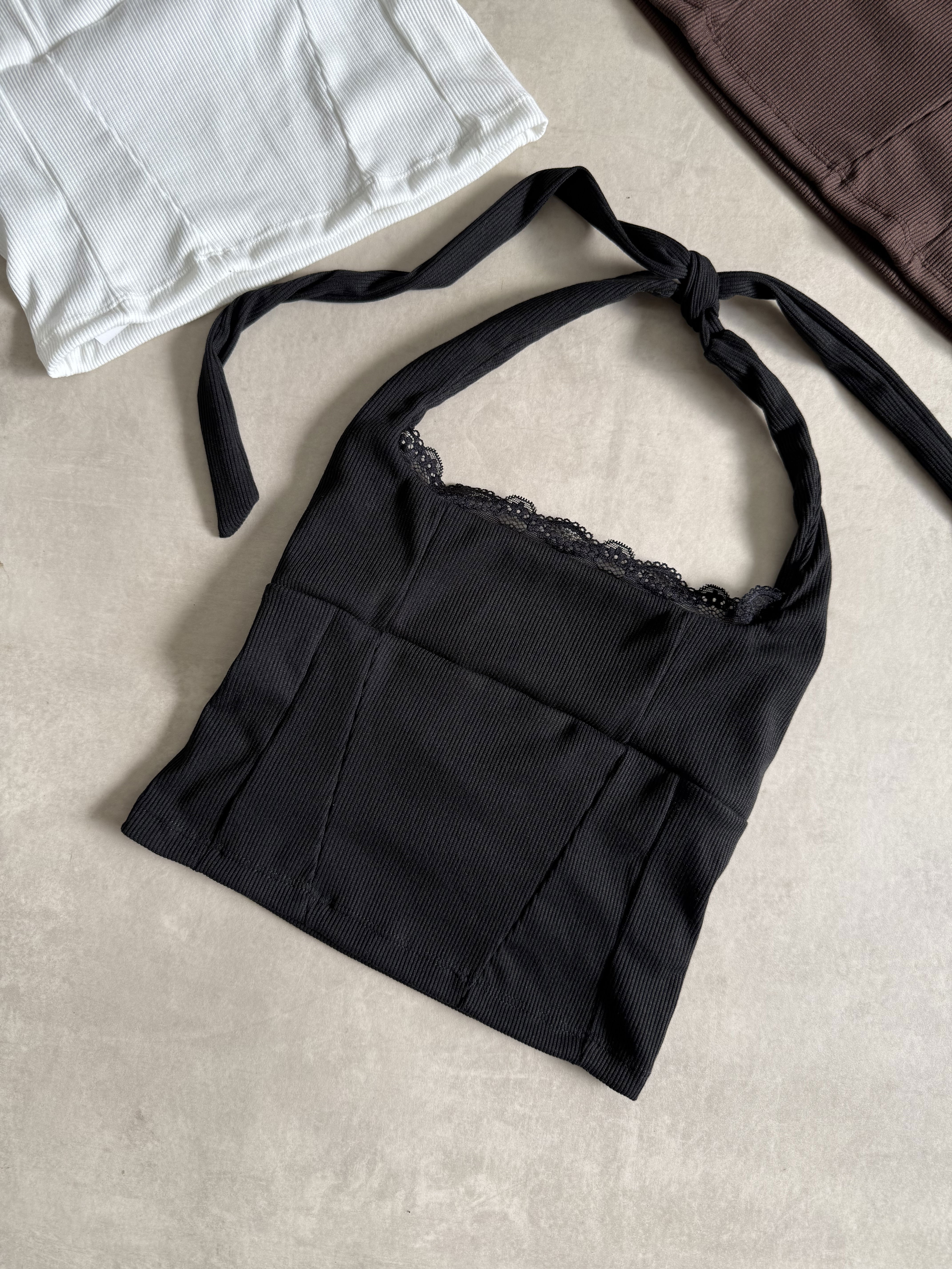 Top de morley con encaje en el busto. Cuenta con dos tiras que se atan en el cuello y tiene doble tela en el busto.