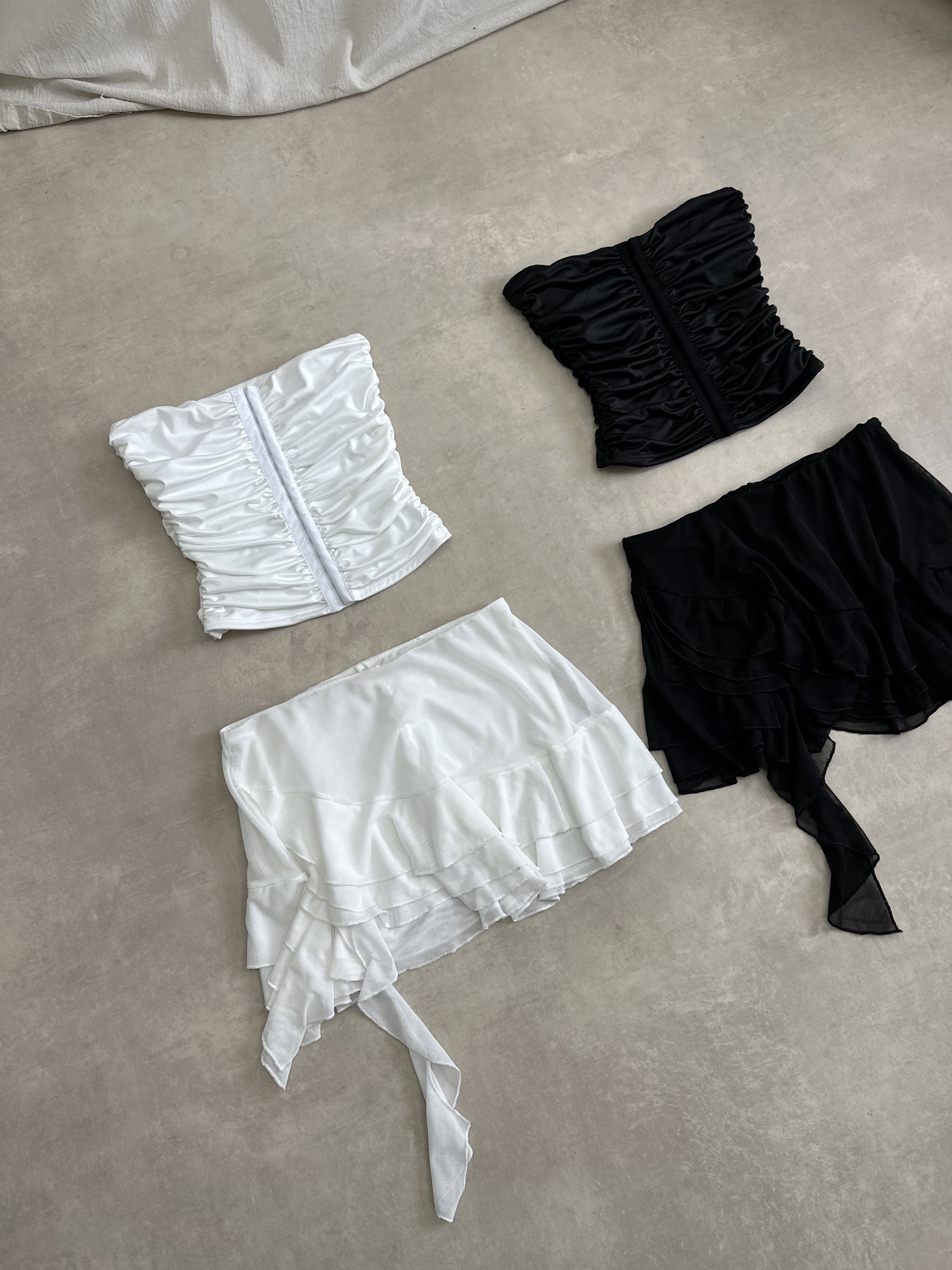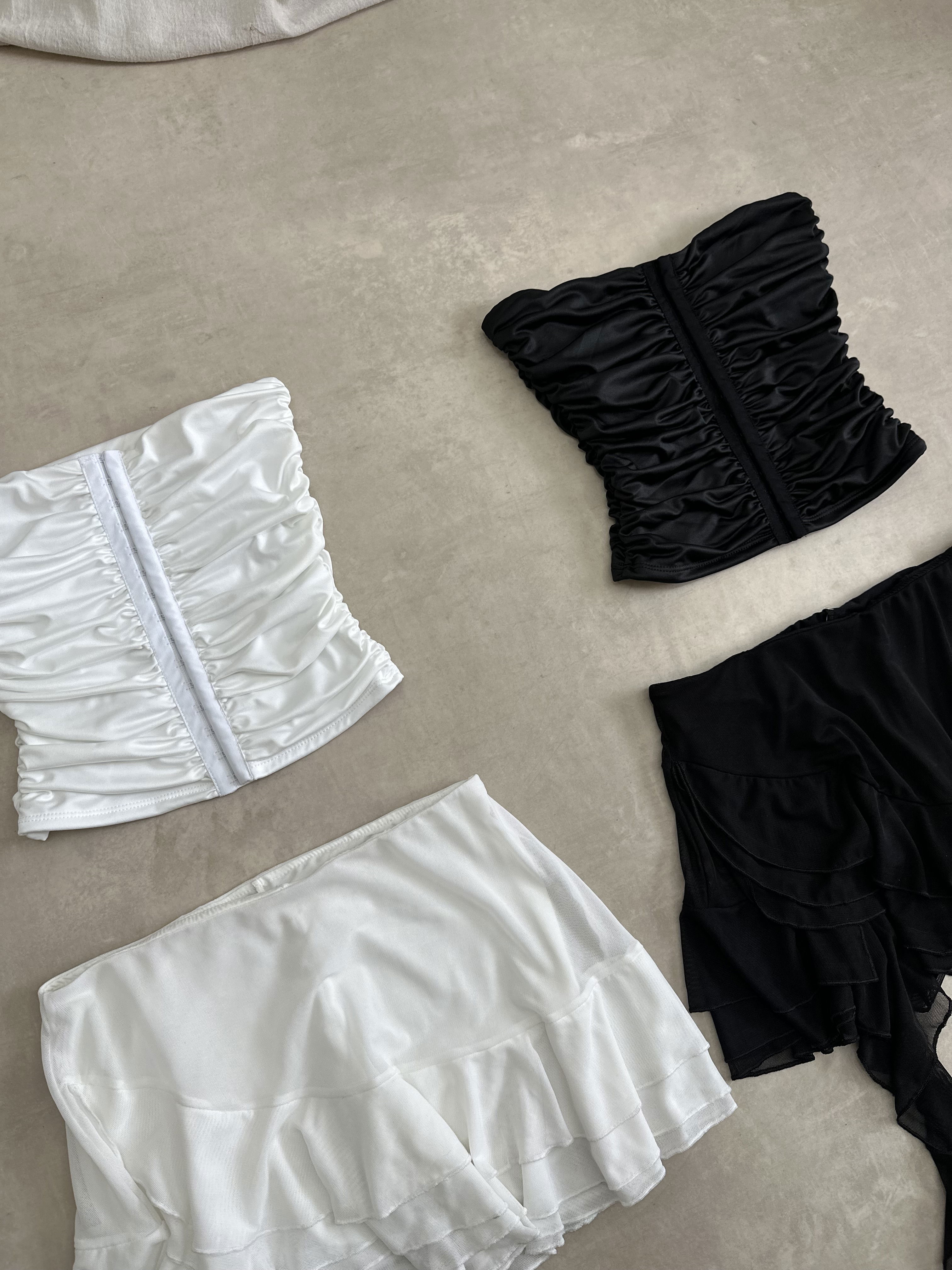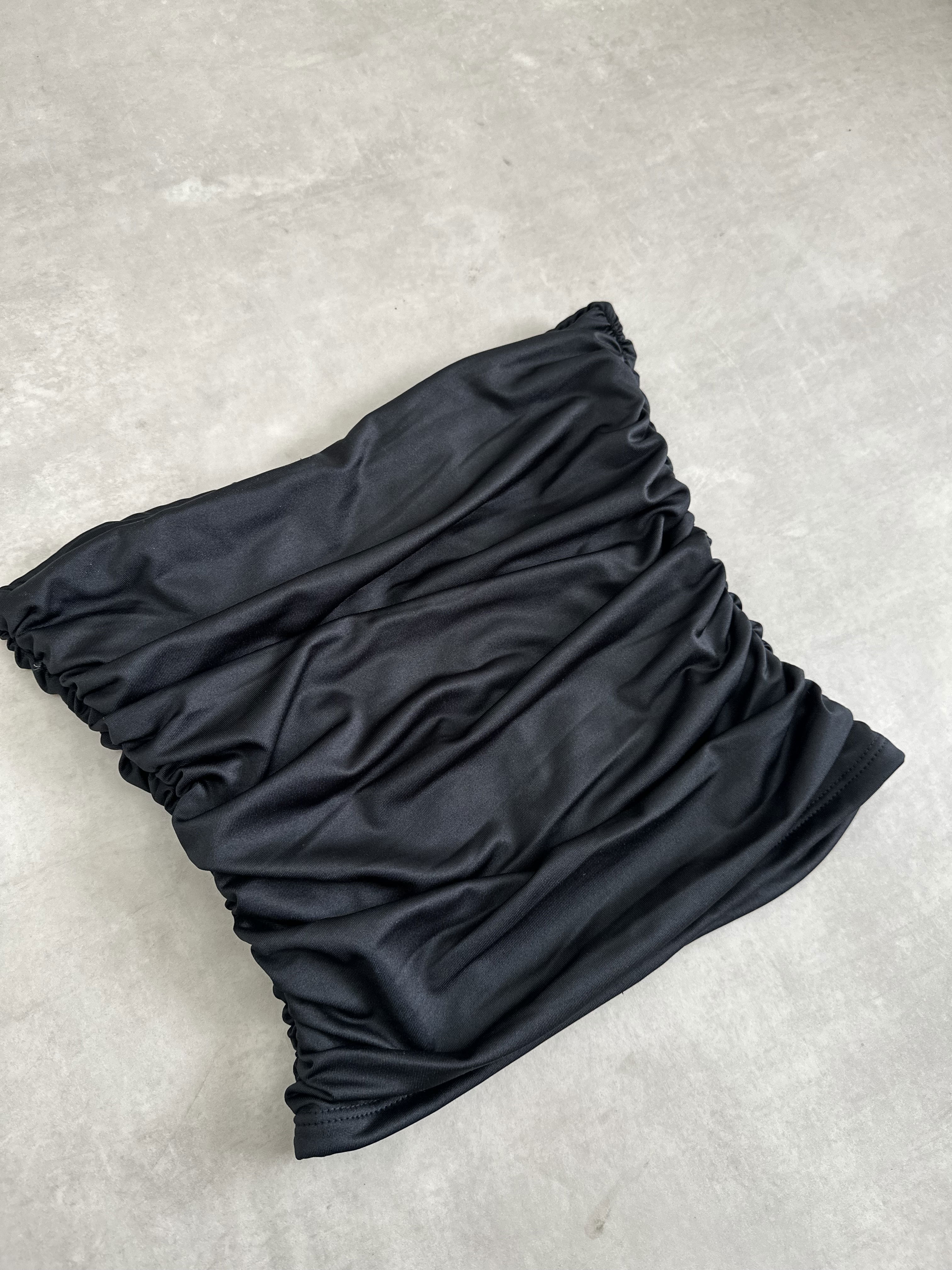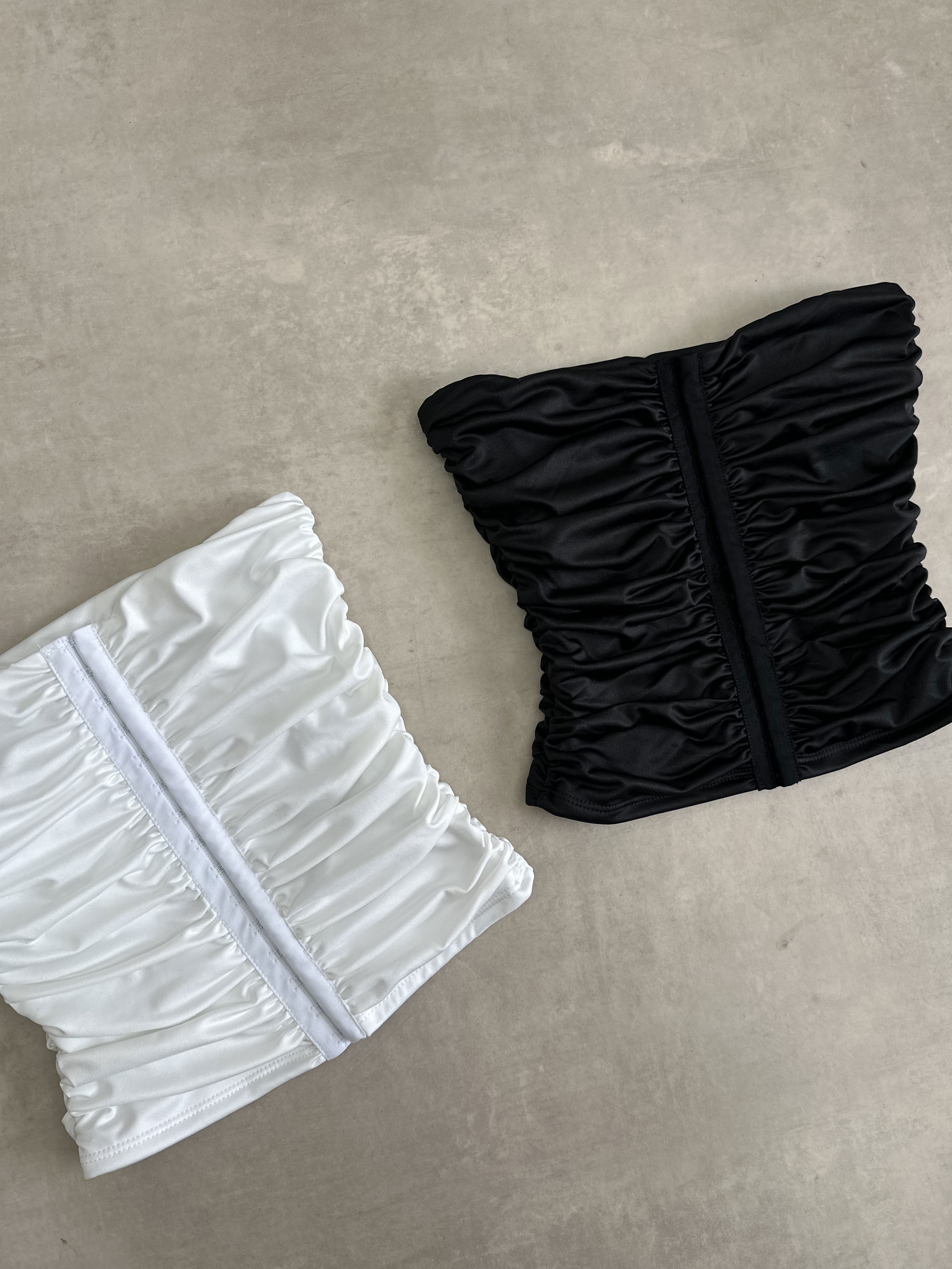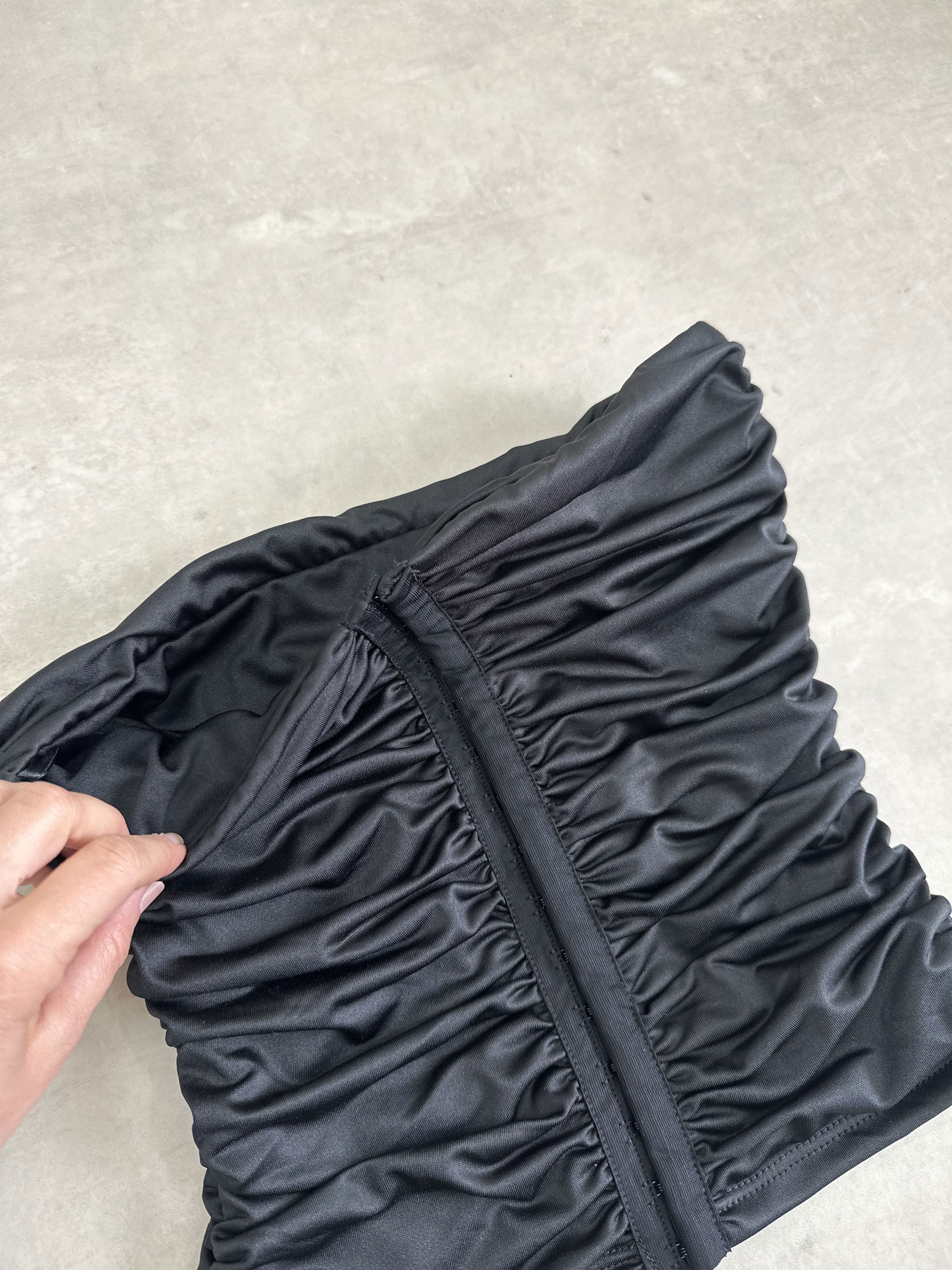Top de microfibra con detalle de ganchos en el frente y frunces en los laterales, está todo forrado. Se puede usar de ambos lados