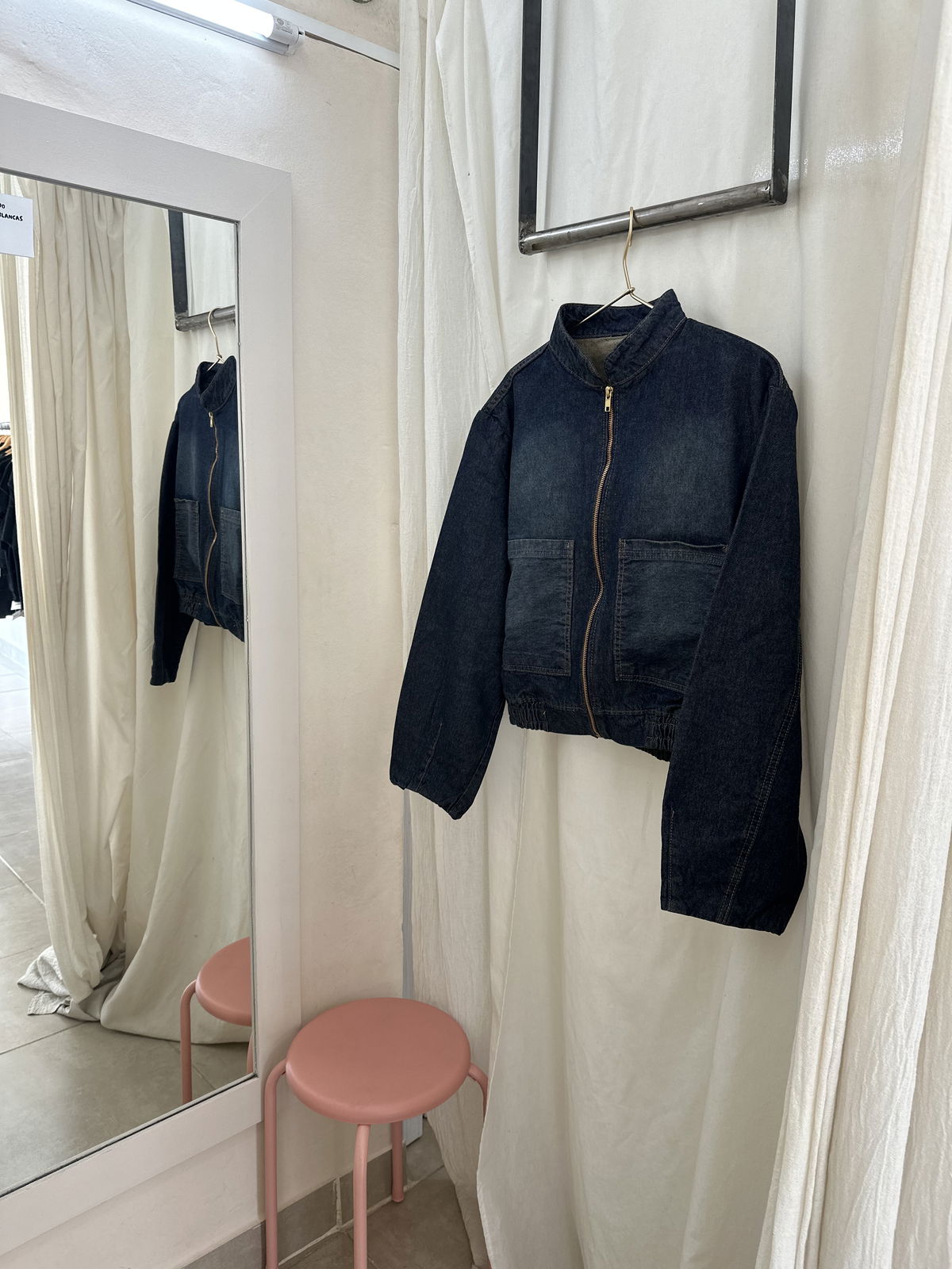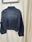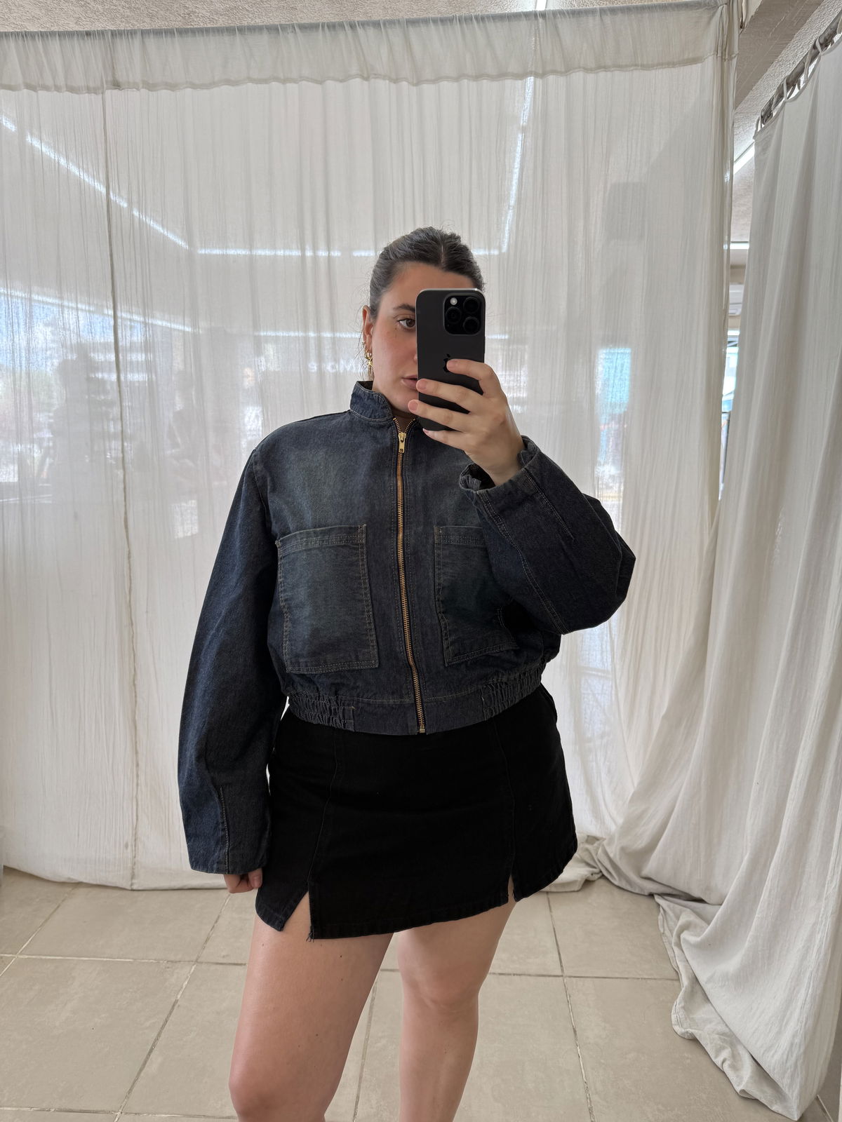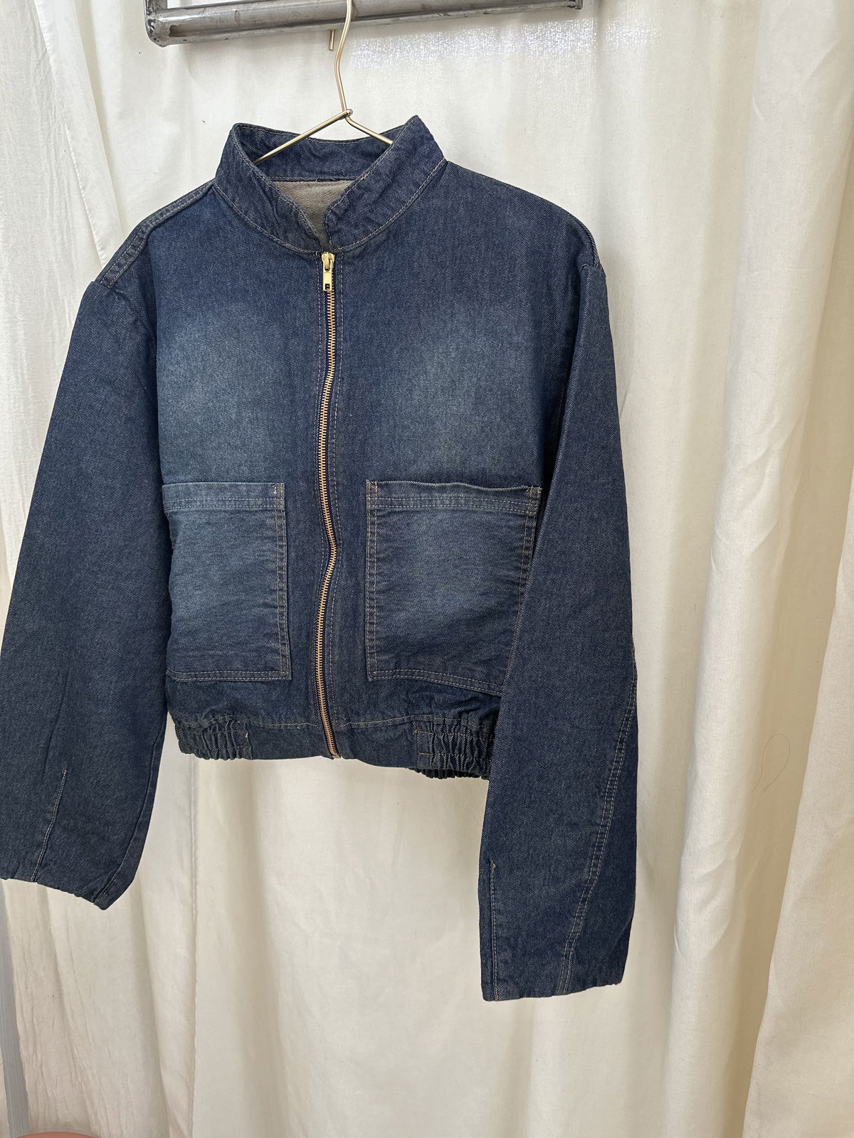 Campera bomber de jean rigido con detalle de elástico y cierre frontal