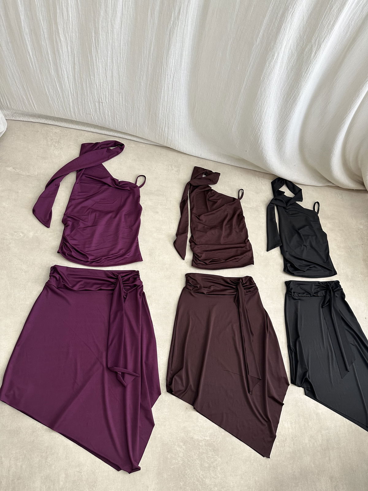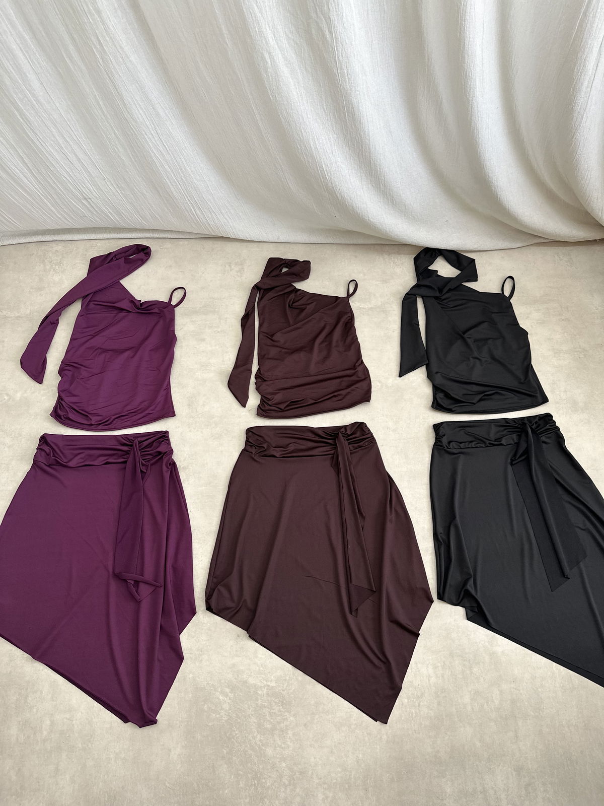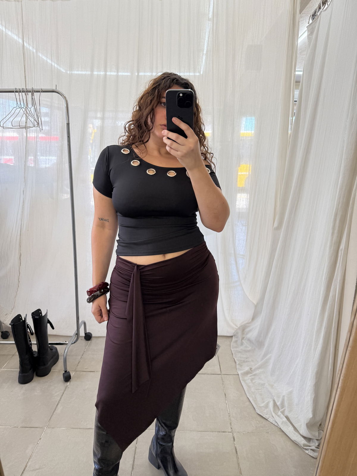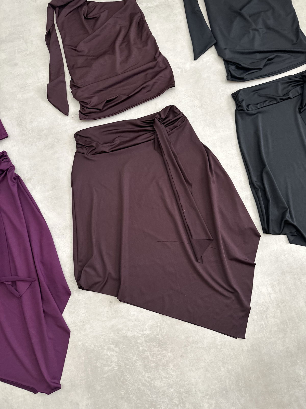 Falda de microfibra elastizado con terminación irregular y lazo que cuelga de la cadera