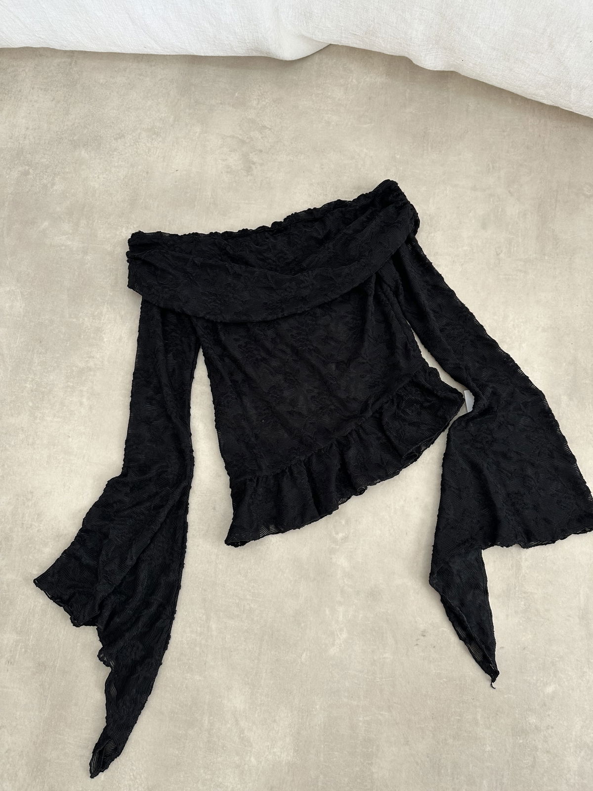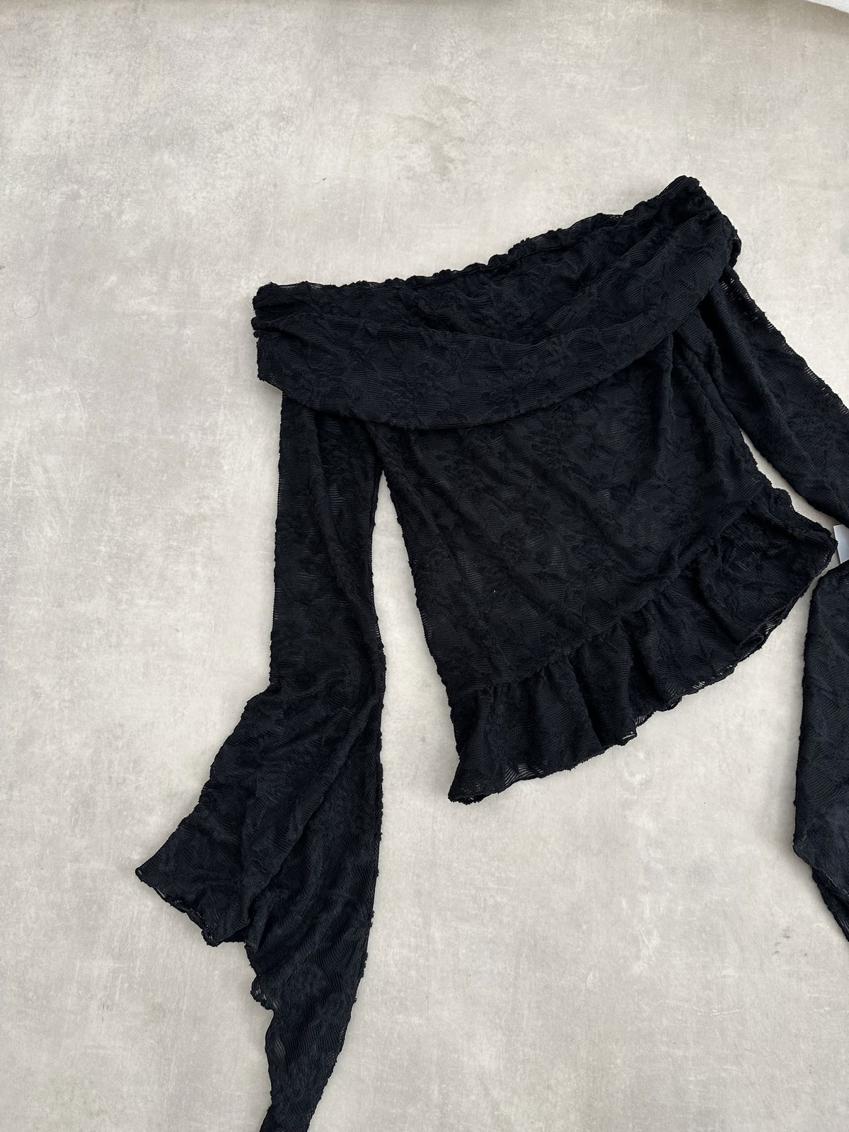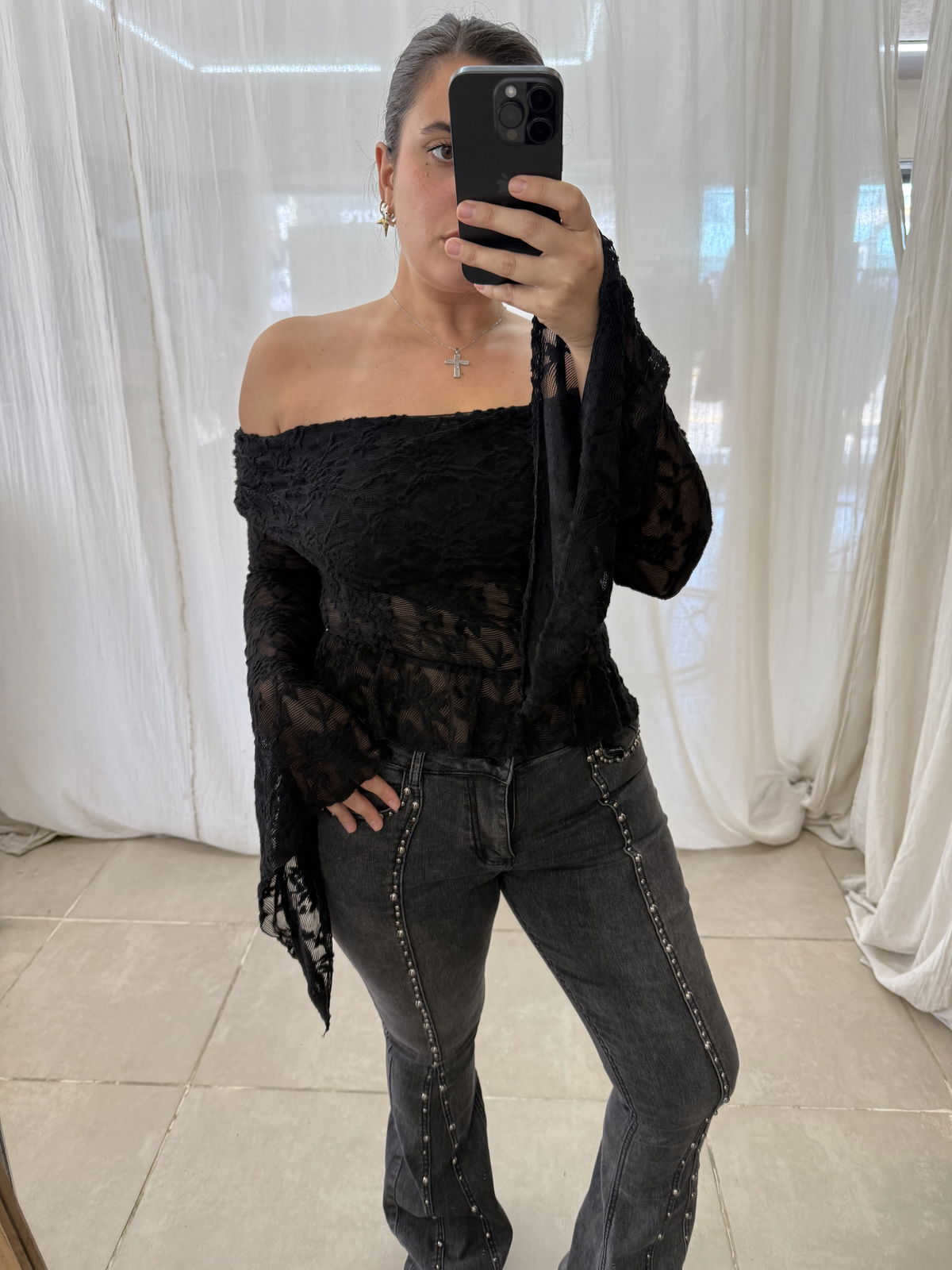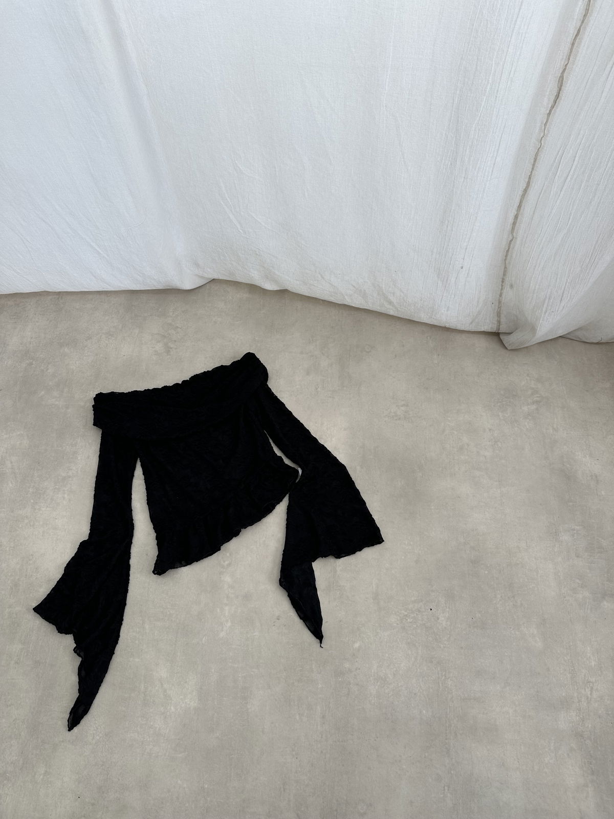 Top strapless de encaje con mangas oxford irregulares y terminación irregular.