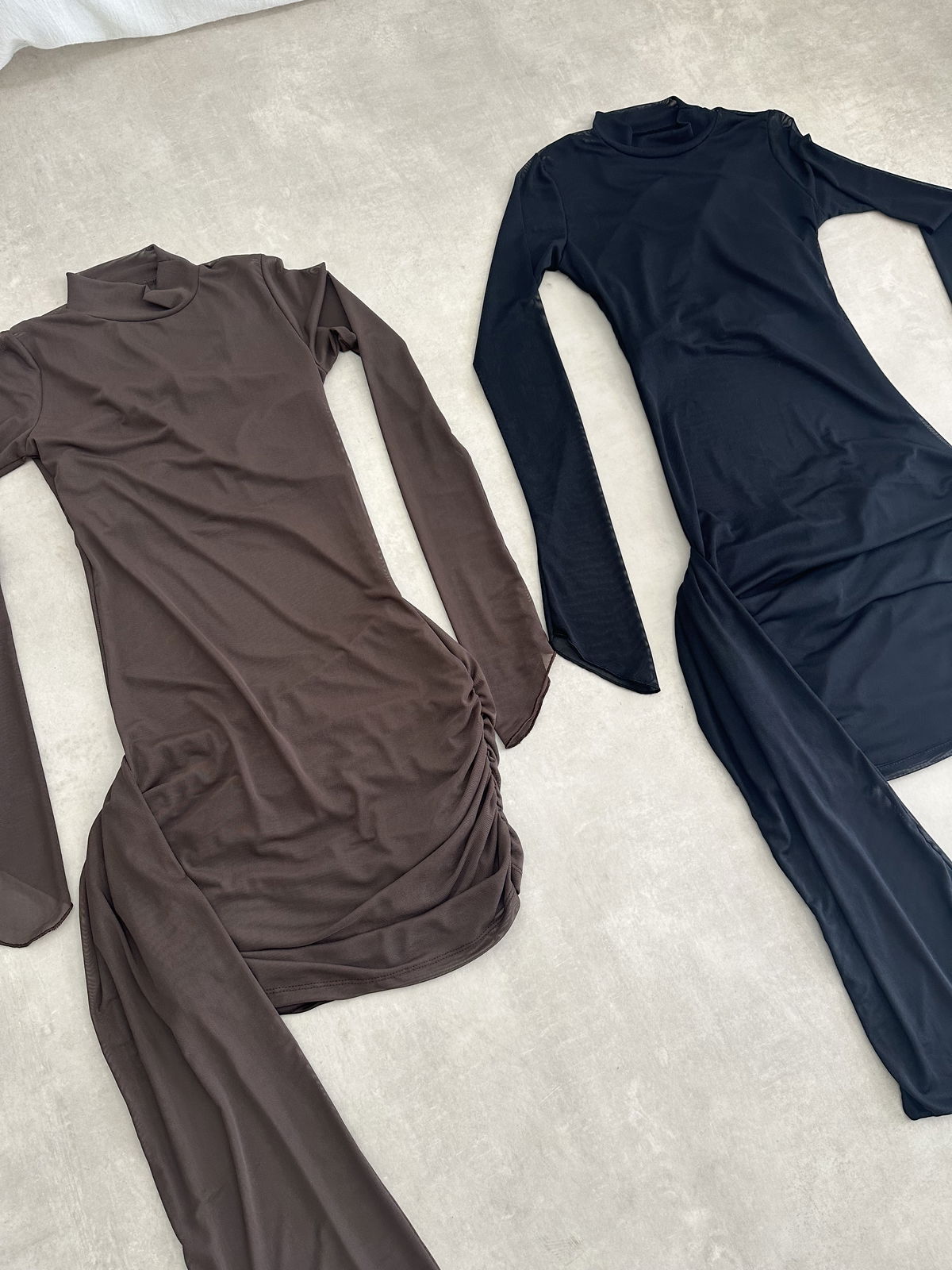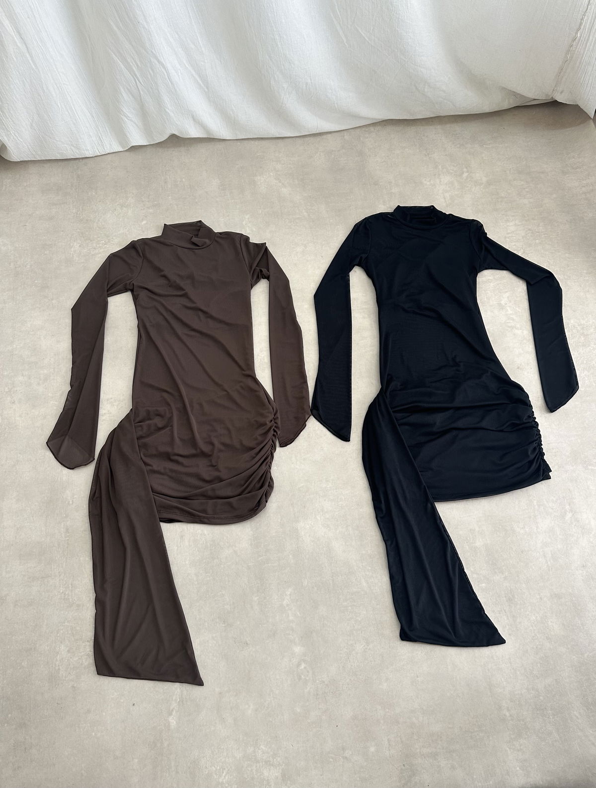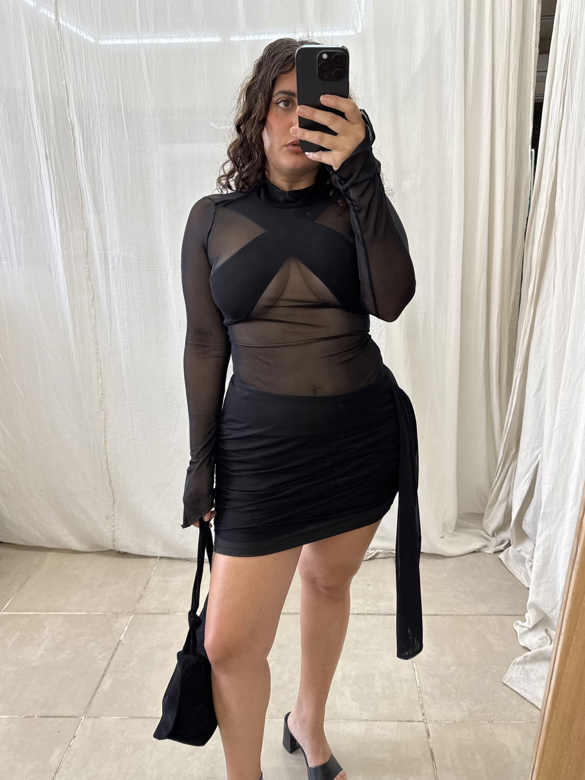 Vestido de microtul elastizado con tiras cruzadas en la zona del busto y falda interna irregular. Tambien tiene un lazo que cuelga de un lateral